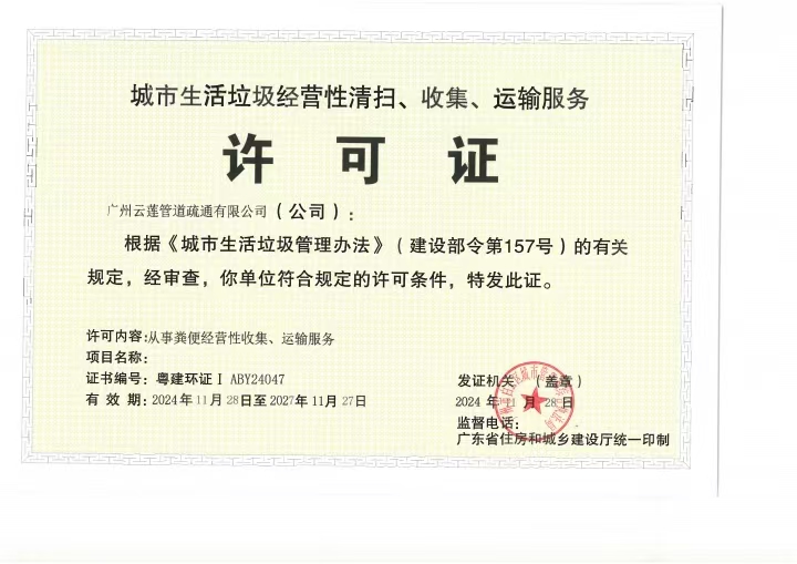 公司资质齐全,合规经营,持有企业营业执照、粪便清运许可证、广州环卫行业经营服务资质证书、道路运输许可证等多项核心资质,是广州环卫行业协会会员单位,取得广州环卫行业经营服务企业等级C级认证,所有作业均符合市政环卫标准,彻底杜绝无资质违规操作,让客户放心托付。