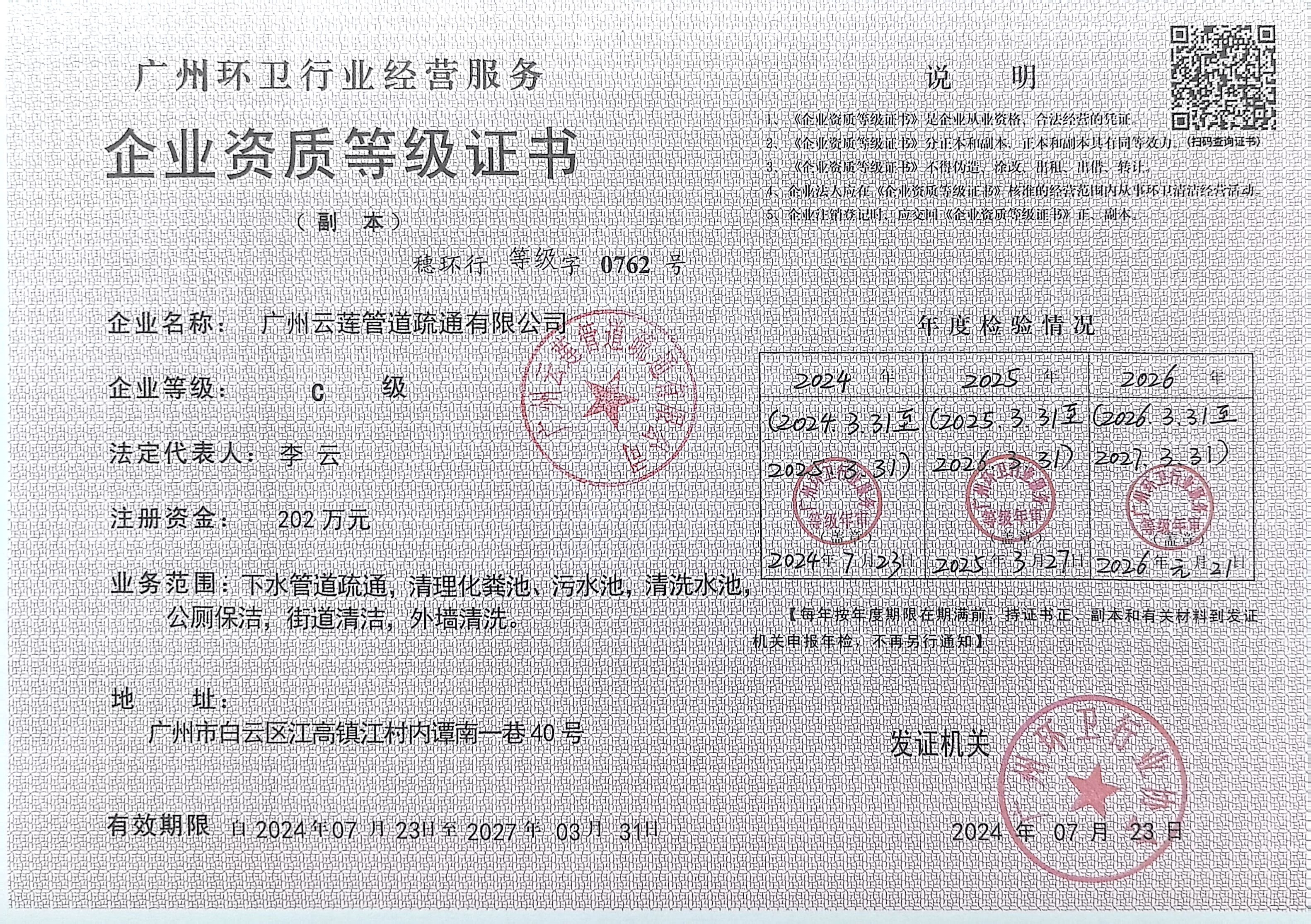 公司资质齐全,合规经营,持有企业营业执照、粪便清运许可证、广州环卫行业经营服务资质证书、道路运输许可证等多项核心资质,是广州环卫行业协会会员单位,取得广州环卫行业经营服务企业等级C级认证,所有作业均符合市政环卫标准,彻底杜绝无资质违规操作,让客户放心托付。